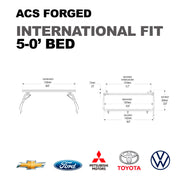 The Leitner ACS Forged International Fitment exclusively fits Non-USA manufactured trucks with a 1.5M Bed.  The rear load bar DOES NOT slide, and it is a "No Drill" application.  The ACS International Fits the following trucks: