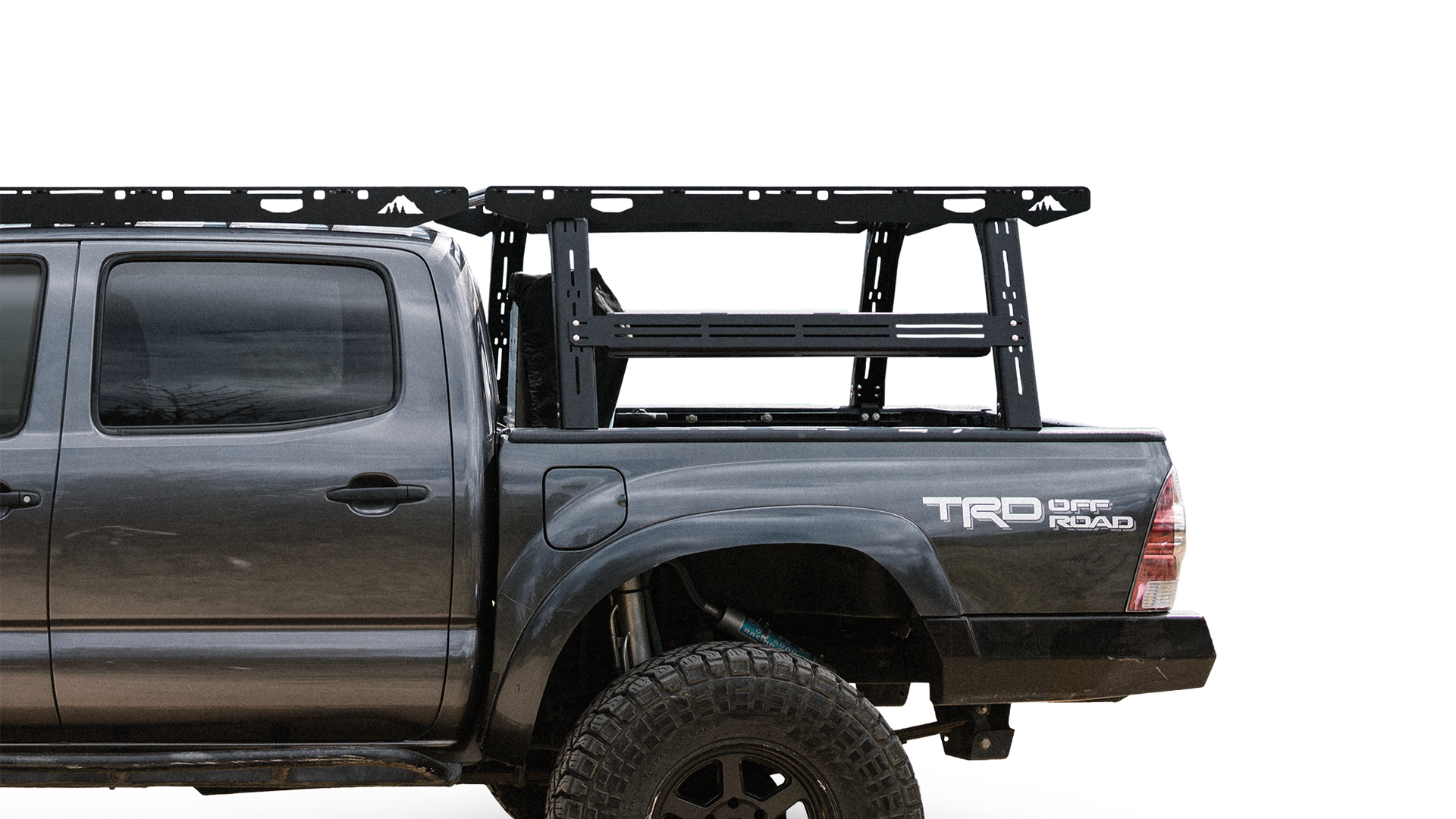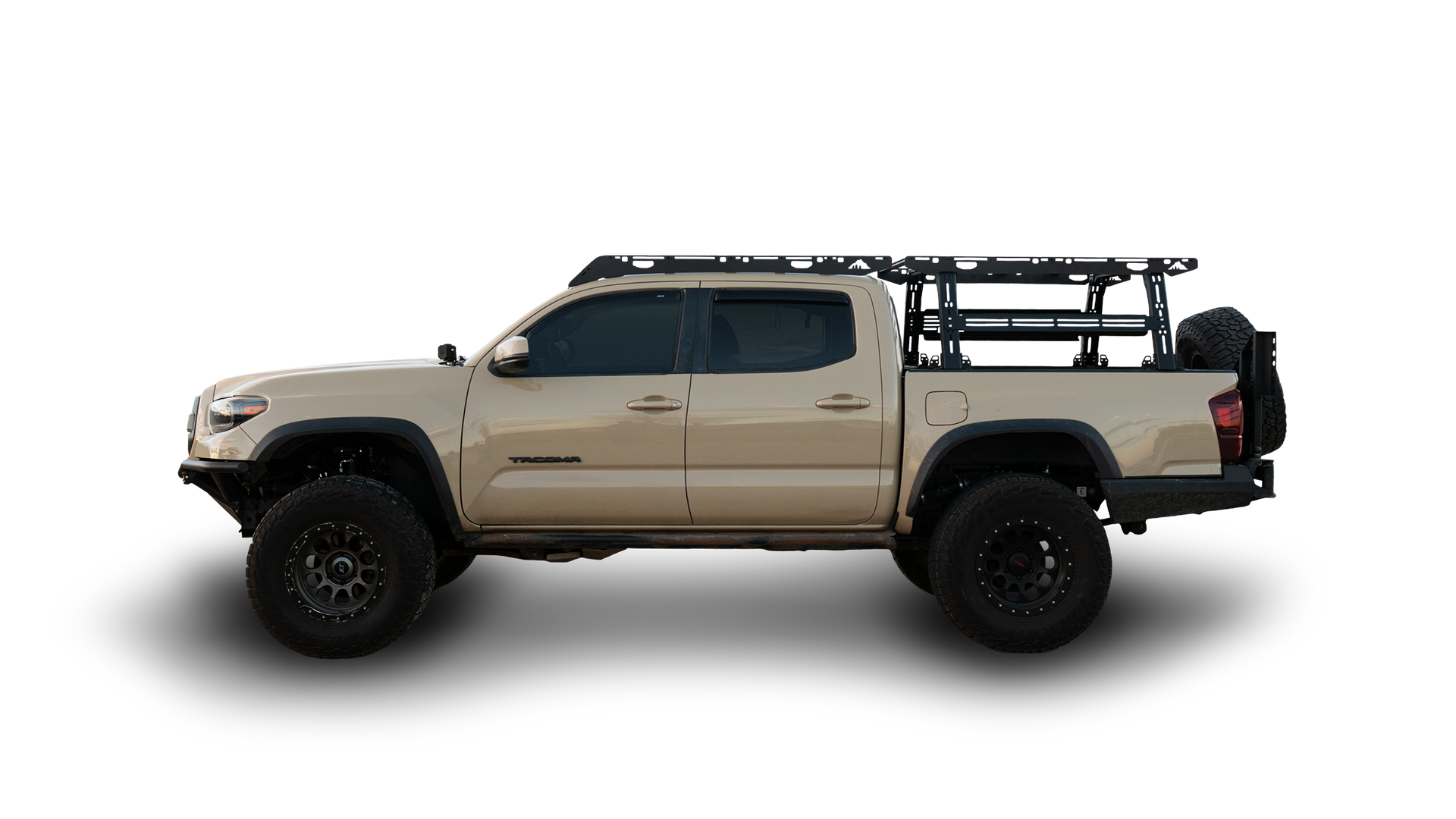 Durable, adaptable, and crafted for adventure, this rack-height PAK System Bed Rack is built with heavy-duty, precision cut, aluminum construction, and stainless steel hardware. It is lightweight and easily outfitted transforming the capabilities of your pickup truck. Whether you are off-roading, overlanding, or running errands around town, this bed rack is built to handle your gear so you can Adventure with Confidence.