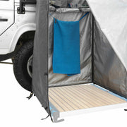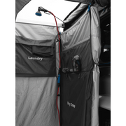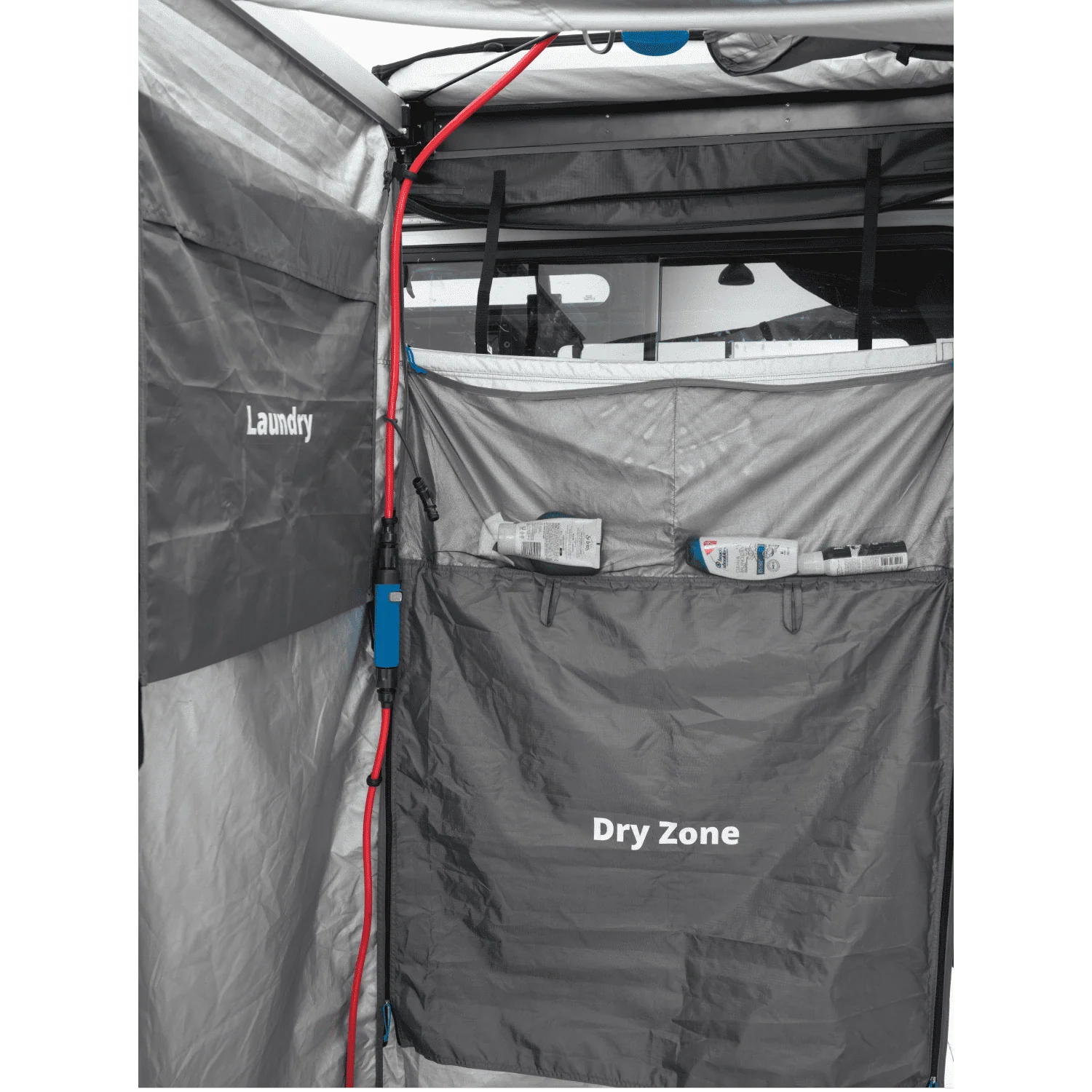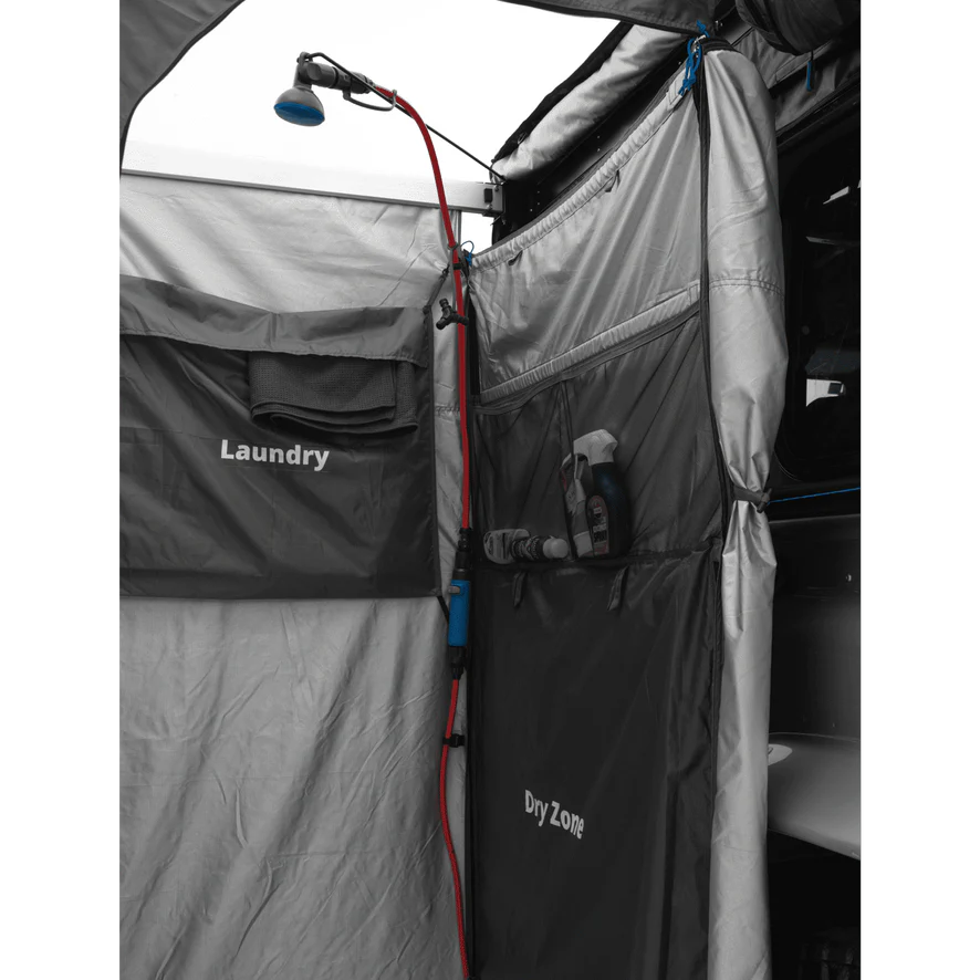 Deployed and packed away in seconds, the ENSUITE Mounted Single, Double, and Triple integrates with your vehicle to create the perfect (forest) floor plan. It’s a true annex – and it looks the part, both outside and in. The dry room offers walk-in access from your vehicle, and the shower space features all the comforts of a home-away-from-home bathroom. And with the optional recirculation- and drain-tray base, you can have loooong hot showers (minus the mud baths) wherever you are.