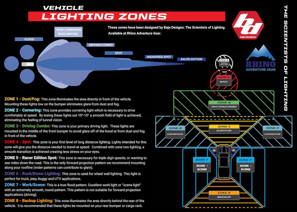 - High Speed Spot: A longer and narrower 6° beam focus for illumination further down the trail or road. The Spot pattern is designed to be used in conjunction with additional Wide Driving and/or Driving/Combo beam lights. (Lighting Zone 4 & 5)
