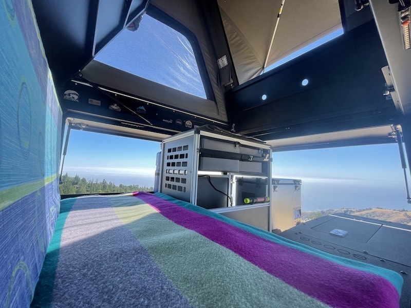 - Two piece sleeping platform allows interior access to the truck bed as well as plenty of room to stand while in the bed of your truck. Rear quarter section of sleeping platform pivots up for easy pass through access