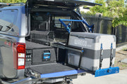Using the slimline handle, the DROP SLIDE-DS50 lowers 30 centimeters while extending out further over the tailgate. This happens in one safe, smooth, controlled motion. At the same time, the platform remains in a perfectly horizontal position and avoids contact with the vehicle. The unique MSA 4X4 blue anodised faceplate provides a tough, durable and easily recognisable finish. The frame is constructed from powder-coated steel and the compact design maximises storage space within the vehicle. The MSA 4X4 DROP SLIDE-DS50 is engineered to be easily installed and the pre-drilled tray holes provide anchor points for most popular fridges. The lock-in, lock-out safety feature locks the slide in its intended position while travelling, preventing potential damage to the fridge and vehicle.